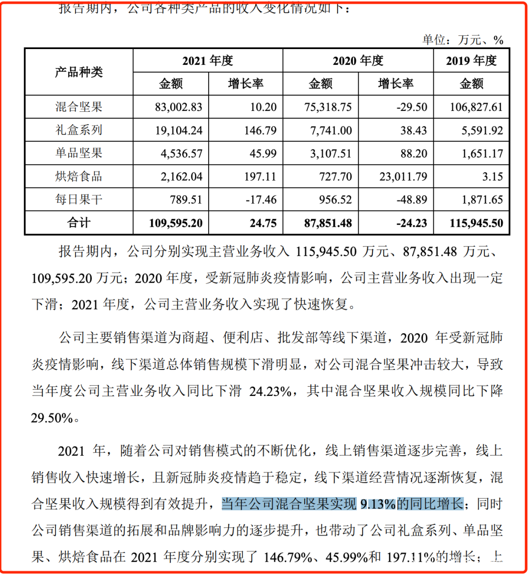 值得一提的是,沃隆食品在分析業績時則表示,“當年(注:2021年)公司混合堅果實現9.13%的同比增長”。但經計算可知,沃隆食品2021年混合堅果收入約為8.30億元,較2020年的7.53億元增長約10.2%。