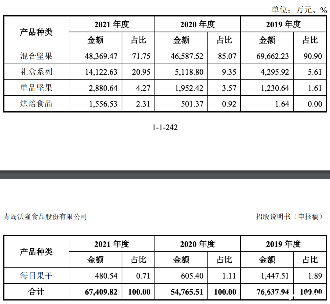 從這個角度來看,沃隆食品算得上是“一招鮮,吃遍天”。根據招股書介紹,沃隆食品的主要產品分為五大類,包括混合堅果、單品堅果、每日果乾、烘焙食品、禮盒系列。報告期各期,該公司主營業務收入佔比分別為99.53%、98.78%和98.92%。