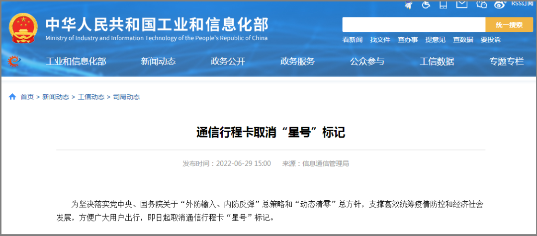 昨日,工信部官網發佈消息稱,為堅決落實黨中央、國務院關於“外防輸入、內防反彈”總策略和“動態清零”總方針,支撐高效統籌疫情防控和經濟社會發展,方便廣大用户出行,即日起取消通信行程卡“星號”標記。