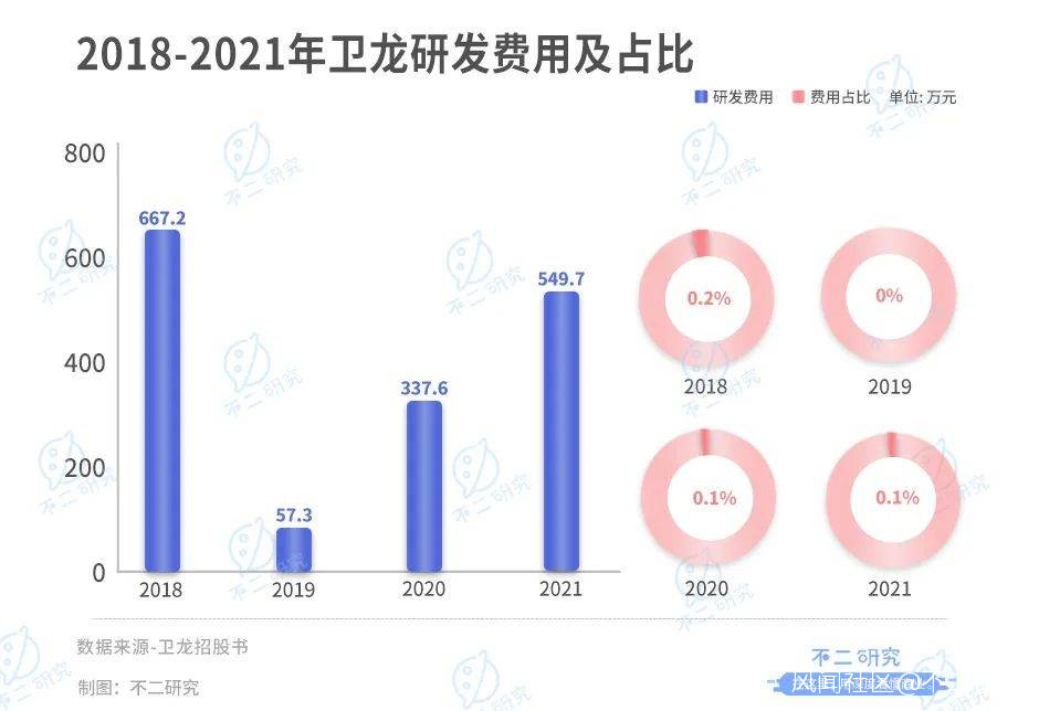 門檻低也體現在較低的研發費用上。招股書數據顯示,2018-2021年,衞龍的研發投入分別為667.2萬、57.3萬、337.6萬和549.7萬元,僅佔總收入的0.1%左右。