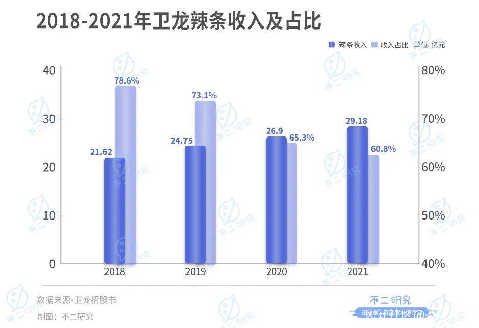 目前,辣條(調味面製品)仍然是衞龍最主要的營收來源,但佔比正逐步縮減:2018-2021年,衞龍辣條的收入分別為21.62億、24.75億、26.90億和29.18億元,佔收入比重分別為78.6%、73.1%、65.3%和60.8%。