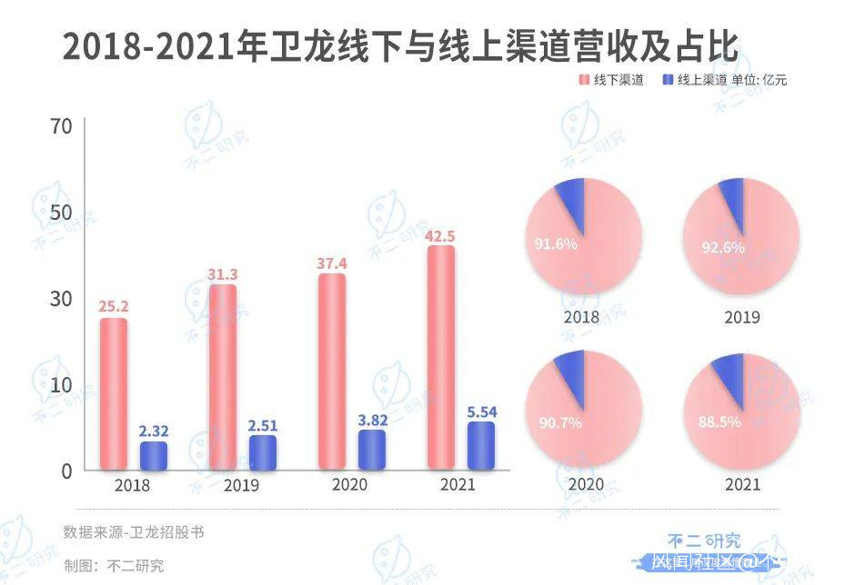 2018-2021年,衞龍線下渠道收入分別為25.2億、31.3億、37.4億和42.5億元,營收佔比高達91.6%、92.6%、90.7%及88.5%。