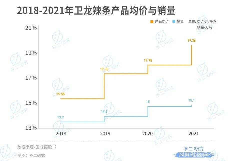 2018-2021年,衞龍辣條產品均價分別為13.9元/KG、14.3元/KG、15元/KG和15.1元/KG,因原材料價格波動,辣條售價略有上漲。而銷量不減反增,同期,辣條銷量分別達到15.55萬噸、17.33萬噸、17.95萬噸和19.36萬噸。