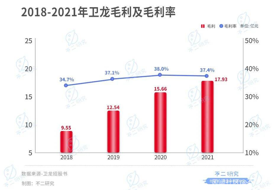 從毛利來看,招股書顯示衞龍2018~2021年分別實現毛利9.55億、12.54億、15.66億和17.93億元,毛利率34.7%、37.1%、38%和37.4%。