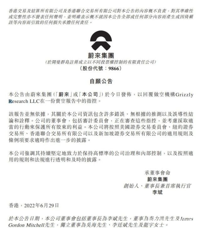 對此,蔚來回應稱,公司已觀察到這份報告,該報告內容充滿了大量不實信息以及對蔚來披露信息的誤讀,蔚來一直嚴格遵守上市公司相關準則,目前已針對該報告啓動相關程序,請關注後續公告。