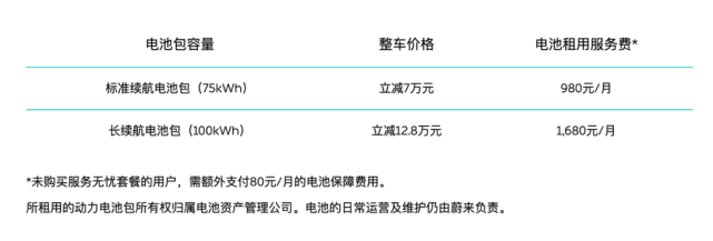 這是蔚來的一項“商業創新”,選擇該服務後,你買到的蔚來汽車是不帶電池的,價格也便宜至少7萬元,之後每月繳納980-1480元的電池租用服務費,即可享受“充電、換電、升級”等一系列服務。