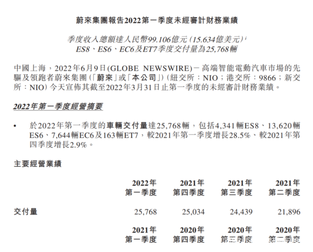 此前發佈的2022年第一季度財報顯示,蔚來實現營收99.11億元,同比增長24.39%,但盈利不及預期,淨虧損達到17.83億元,2021年同期虧損4.5億元,同比擴大295.56%。