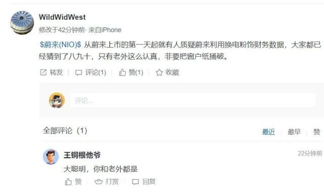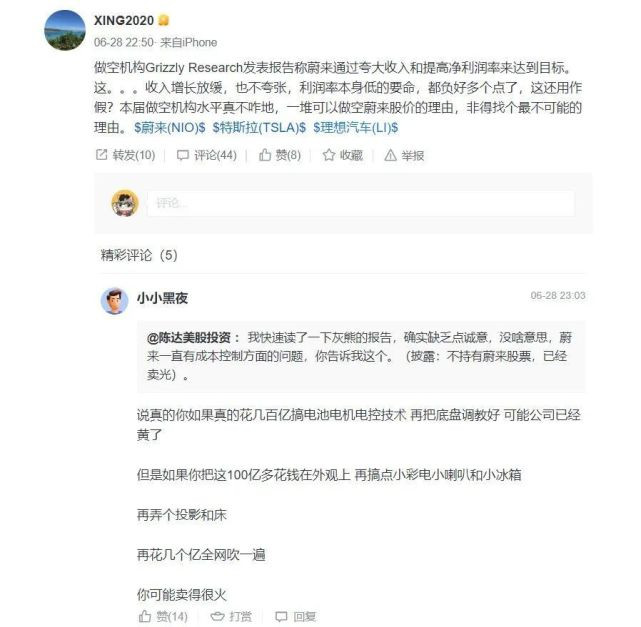 另有網友表示,一堆可以做空蔚來股價的理由,非得找個最不可能的理由!灰熊這份報告,缺乏誠意。