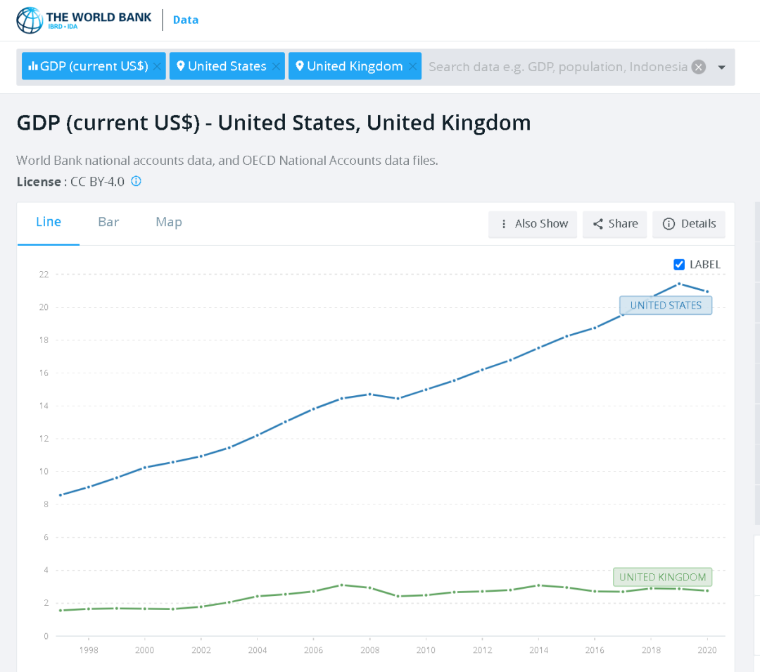 我們又單獨選擇了英國與美國進行對比,結果發現在1997年時,英國的GDP(約為1.56萬億美元)曾是美國GDP(約為8.58萬億美元)的近20%,為18%。可到了2020年,這個比例卻跌到了13%,正不斷逼近10%。