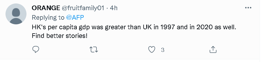 有人還發現,即便是在法新社貼出的那張圖片中,也寫着香港的GDP從1997年的1770億美元增加到了2020年的3465.9億美元的情況,以及香港的人均GDP仍然是內地4倍多的情況。可法新社為了帶節奏挑撥內地和香港的關係,卻完全略過了這些事實,其報道正文的文字部分沒有一處提到這些情況。