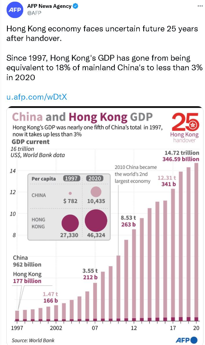 如下圖所示,在這篇題為“迴歸25年後,香港經濟正面臨的不確定性”的文章中,法新社的一個核心邏輯是,在1997年剛回歸中國時,香港的GDP曾是內地的18%,而在2020年時這個比例則跌到了不到3%。