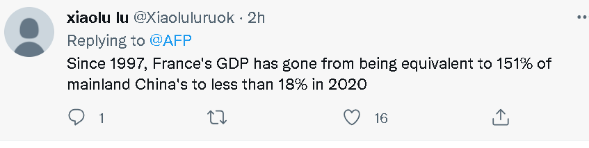 如下圖所示,有人就用法新社的這種玩兒法,把法國在1997年和2020年的GDP數據與中國進行了對比,結果發現法國混得才真叫慘。1997年時法國的GDP(約為1.45萬億美元)曾是中國(約為9620億美元)的151%,可2020年時的法國GDP(約為2.63萬億美元)卻連中國(約為17.7萬億美元)的18%都不到。