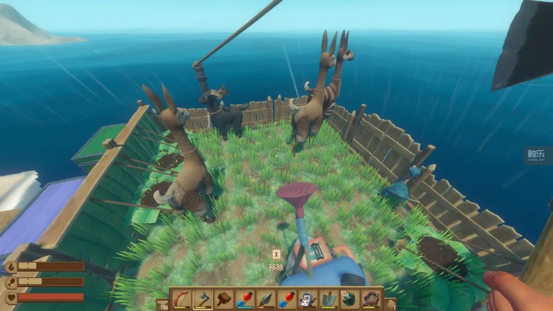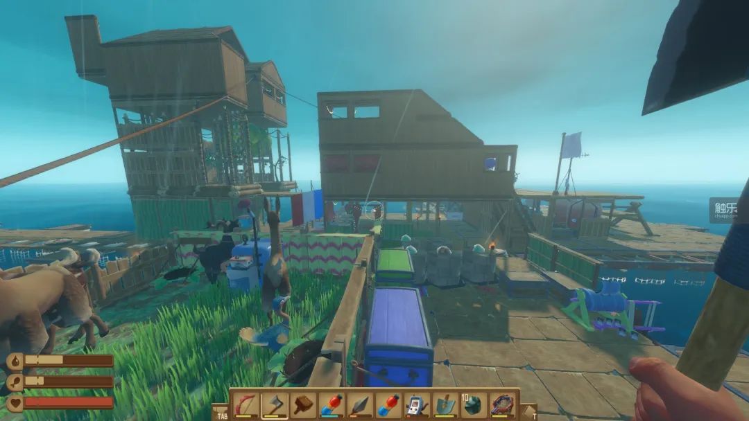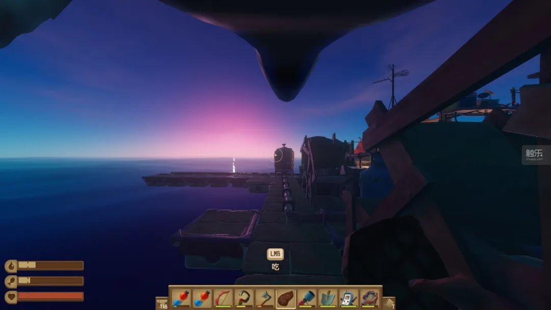 在所有求生類遊戲中,《Raft》的早期版本看起來不算特別有意思:玩家出生在一艘木筏上,靠手中的抓鈎收集海上漂浮的素材,建造設備,擴展木筏。但實際玩起來卻有一種奇妙的魅力:拋收抓鈎的過程就像是3D版本的“黃金礦工”,這種收集與建造的體驗給人帶來上癮般的快樂。