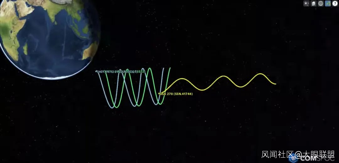 然而戲劇性的一幕發生了。提供空間態勢感知服務的商業公司COMSPOC發佈的模擬視頻顯示,當“美國270”衞星接近試驗十二號衞星01星、02星時,兩顆中國衞星反方向機動以躲避追蹤,其中試驗十二號衞星02星還進入日照區,反過來“直視”試圖“偷窺”它的“美國270”衞星。