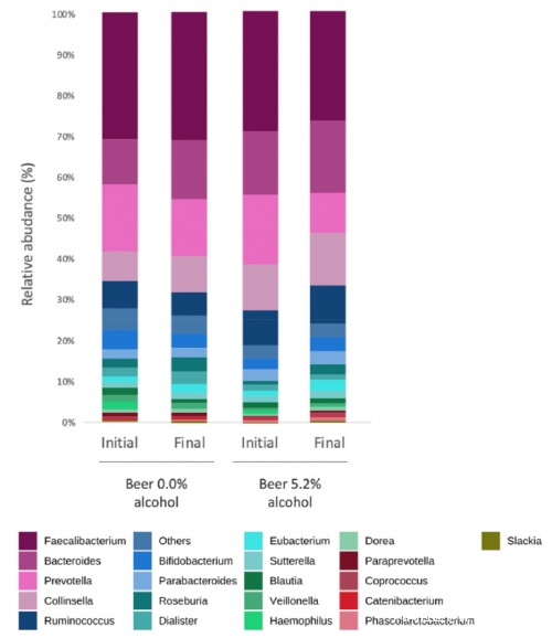 該研究招募了22名健康男性,隨機平均分配到兩組,在為期4周的研究期間,分別每天飲用330mL的酒精啤酒,或正常啤酒(5.2%酒精度)。在開始研究前和研究結束後,分別收集他們的血液和糞便樣本。通過16S rRNA 測序分析他們的腸道菌羣。實驗結果顯示,連續4周,每天飲用無酒精啤酒或含酒精啤酒,不會增加體重和體脂,也不會顯著改變血清心臟代謝生物標誌物。