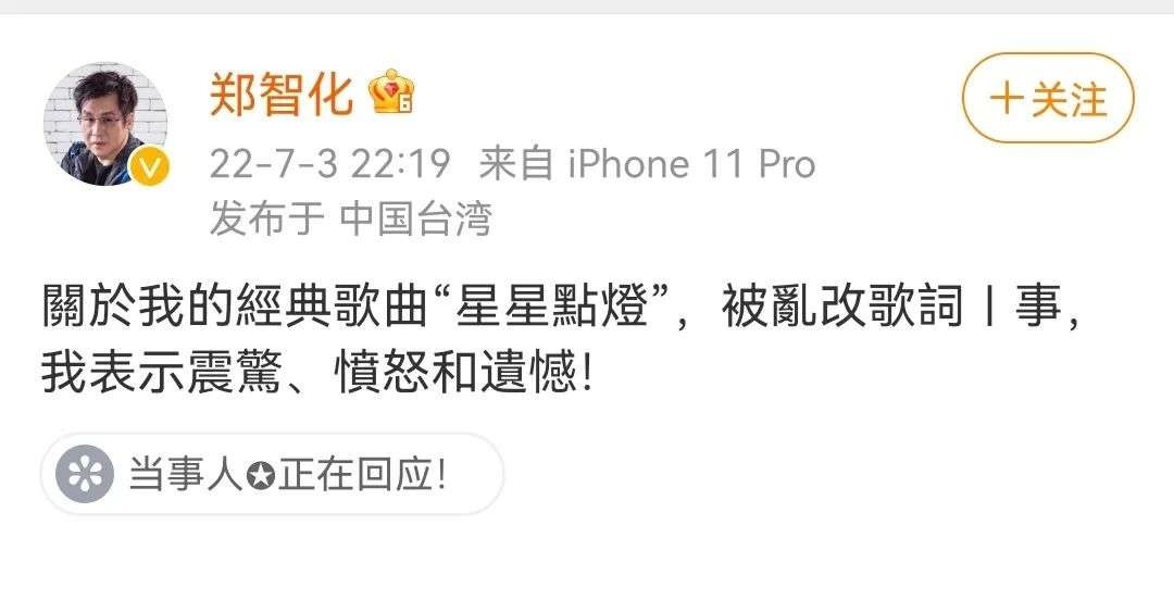 事件的導火索,便是原唱及詞曲作者鄭智化得知歌詞被亂改後的發文。這位曾因《水手》《星星點燈》《老幺的故事》等經典作品叱吒上世紀90年代流行樂壇的音樂人,在微博上表示“震驚、憤怒和遺憾”。