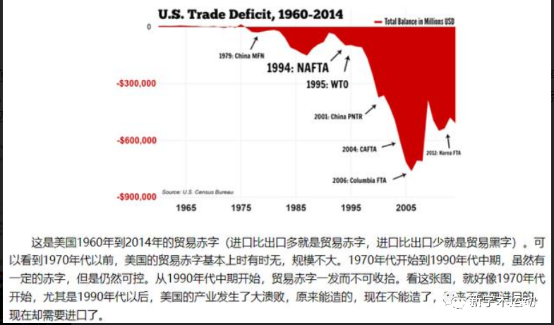 第一張圖是美國的貿易赤字長期變化圖。可以看出,從上個世紀70年代美國的貿易赤字開始增長,進入90年代更是一發不可收。巨大的貿易赤字意味着美國產業的中空化,本國不生產、不製造了,而是從外國進口。