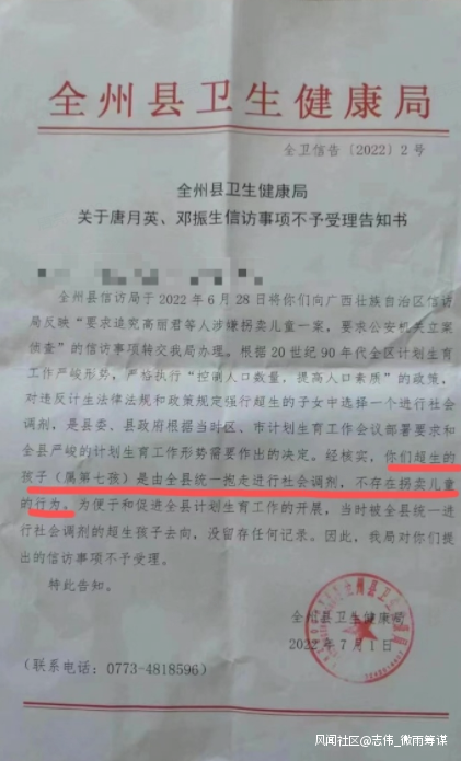 告知書中提到,根據20世紀90年代全區計劃生育工作嚴峻形勢,嚴格執行“控制人口數量,提高人口素質”的政策,**對違反計生法律法規和政策規定強行超生的子女中選擇一個進行社會調劑,是縣委、縣政府根據當時區、市計劃生育工作會議部署要求和全縣嚴峻的計劃生育工作形勢需要作出的決定。**經核實,**你們超生的孩子(屬第七孩)是由全縣統一抱走進行社會調劑,不存在拐賣兒童的行為。**為便於和促進全縣計劃生育工作的開展,當時被全縣統一進行社會調劑的超生孩子去向,沒留存任何記錄。因此,我局對你們提出的信訪事項不予受理。