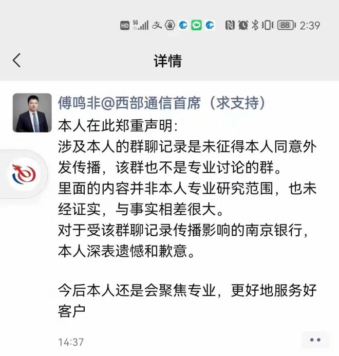 在股市表現的跌宕起伏之下,“西部證券通信首席傅鳴非”在某羣聊中發佈的觀點或成為導火索,並將南京銀行推上輿論的風口浪尖。