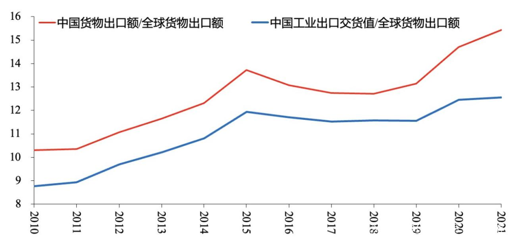 進一步觀察中國出口在全球的市場份額(圖2),比如中國貨物出口佔全球貨物出口的份額和中國的工業出口交貨值佔全球貨物出口的份額,可以發現,雖然這些指標在過去十年裏有所波動,但是總體都顯示出,2021年中國出口佔全球的市場份額要遠高於2010年時的水平。其中,以工業交貨值為口徑,2010年其所佔份額不足9%,2021年份額超過12%。