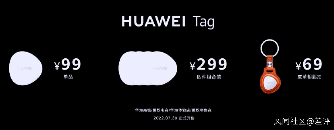 華為 Tag 單個售價 99 元,4 枚套裝 299 元,皮革鑰匙扣 69 元。