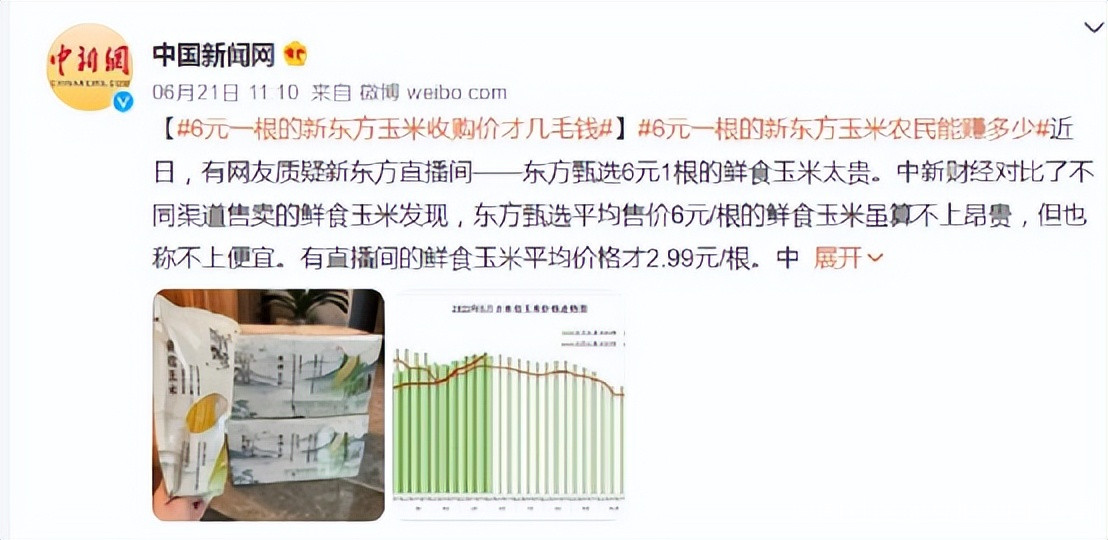一個就是價格貴,你沒看錯,6元1根的玉米上了熱搜,已然説明價格高成了其無形的標籤之一,主打甄選助農,但無論吃得喝得價格都不便宜,儘管董宇輝解釋稱“穀賤傷農”,但似乎高估了網友的購買力,朋友圈,微博不乏吐槽聲。