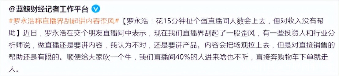 回到正題,羅永浩的調侃(即便不具象指誰)有沒有價值?至少我認為是值得深思的,因為他引出了直播帶貨的一個重要議題——內容重要還是產品重要?