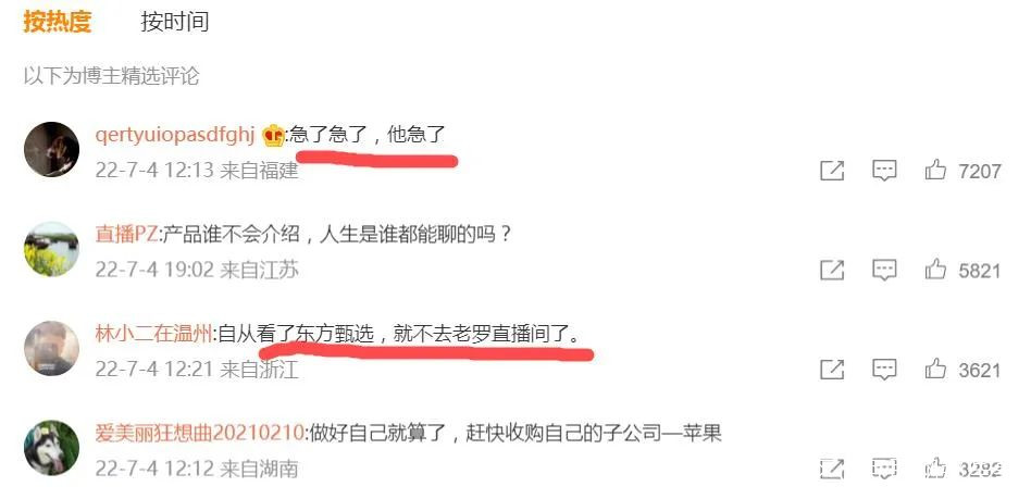 在相關媒體報道的評論區,有網友表示“急了急了,他急了”收穫了7000多的高贊,還有網友稱“自從看了東方甄選,就不去老羅直播間了”,當然,也不乏老羅做手機時遺留的缺德粉讓羅永“做好自憶,趕快收購子公司蘋果”……