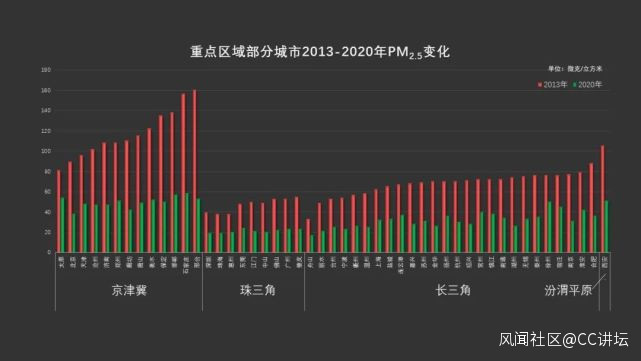 也就這十年間,我們用《大氣中國》年度報告記錄着中國空氣質量改善的進程。這張圖展示的就是在2013年到2020年間,連續兩個國家大氣污染防治行動計劃下,重點區域部分城市的pm2.5的變化。