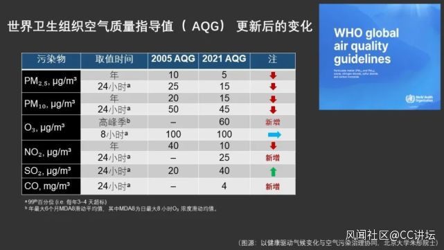 世界衞生組織在去年發佈了更新的空氣治理指南,受世衞組織的邀請,我有幸參加了它的修訂工作。世衞組織的空氣質量指南是從保護人體健康的角度為我們設定了一個指導值,又從空氣質量管理的角度來劃分了幾個不同階段的過渡目標。在指導值修訂之後,依據最新的指南,pm2.5的年均濃度是已經降低到5微克每立方米,而我國大部分的城市現在處於的是第一階段和第二階段的過渡目標之間,也就是説年均濃度是25~35微克每立方米。
