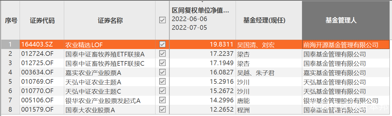 在Choice數據上,共計有8只農牧飼漁行業主題基金(份額分開計算),這些基金近1個月漲幅明顯,均在10%以上,最高接近20%。具體來看,前海開源基金旗下的農業精選LOF(164403)近1個月上漲19.83%,成功登頂榜首。國泰中證畜牧養殖ETF聯接A/C漲幅均超過17%,嘉實農業產業股票A(003634)上漲16.08%。天弘中證農業主題A/C上漲超過15%,銀華農業產業股票發起式A(005106)漲幅也來到了14.30%,另外國泰大農業股票A(001579)同期上漲12.27%。