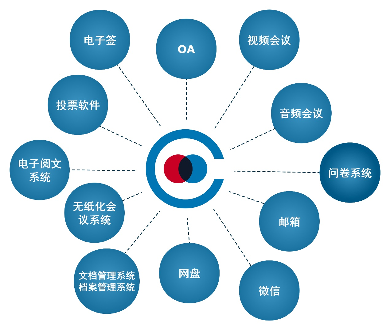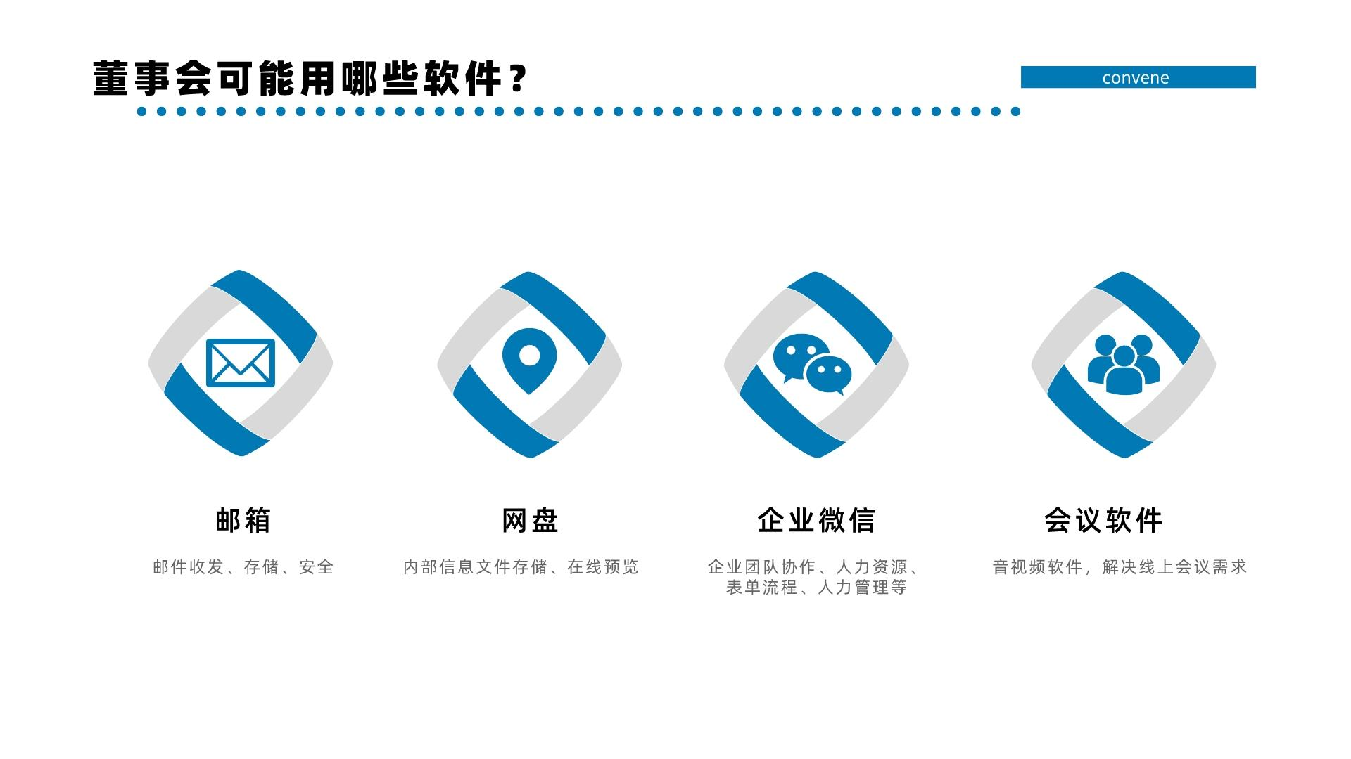會前會後董事雲通過“雲同文”、“雲會議”可以實現郵件的文件分發與議案通知、網盤的文件存儲、微信的信息交互、會議軟件的開會功能等等,將多功能整合,使功能集成於一個系統中,減少多軟件的信息壁壘,讓信息傳達更流暢,將董事會所需多功能整合,功能集成能夠大大提高董事會的效率。