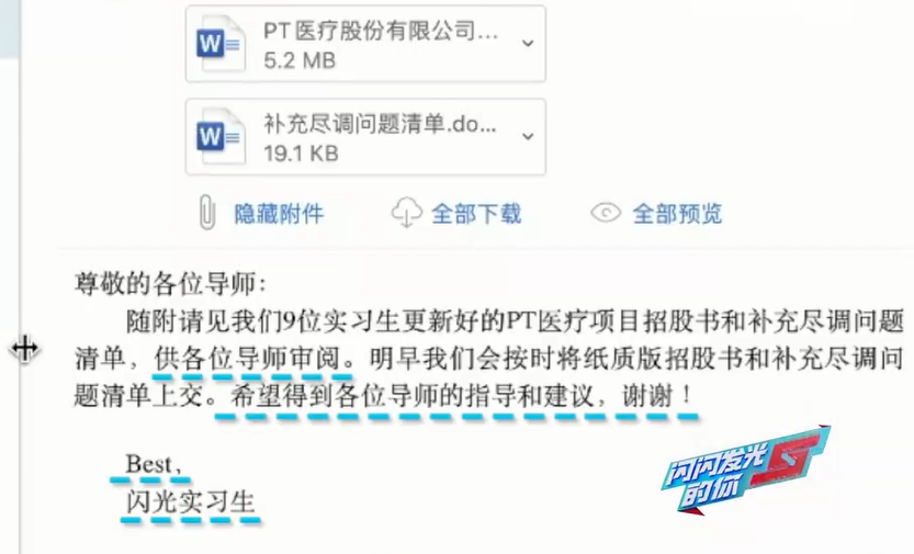 在沒意識到這點的時候,很多職場新人有時候就會有一種僥倖心理,會像對待作業一樣對待工作,就比如節目裏實習生們發現交上去的招股書裏有一處嚴重的錯別字。