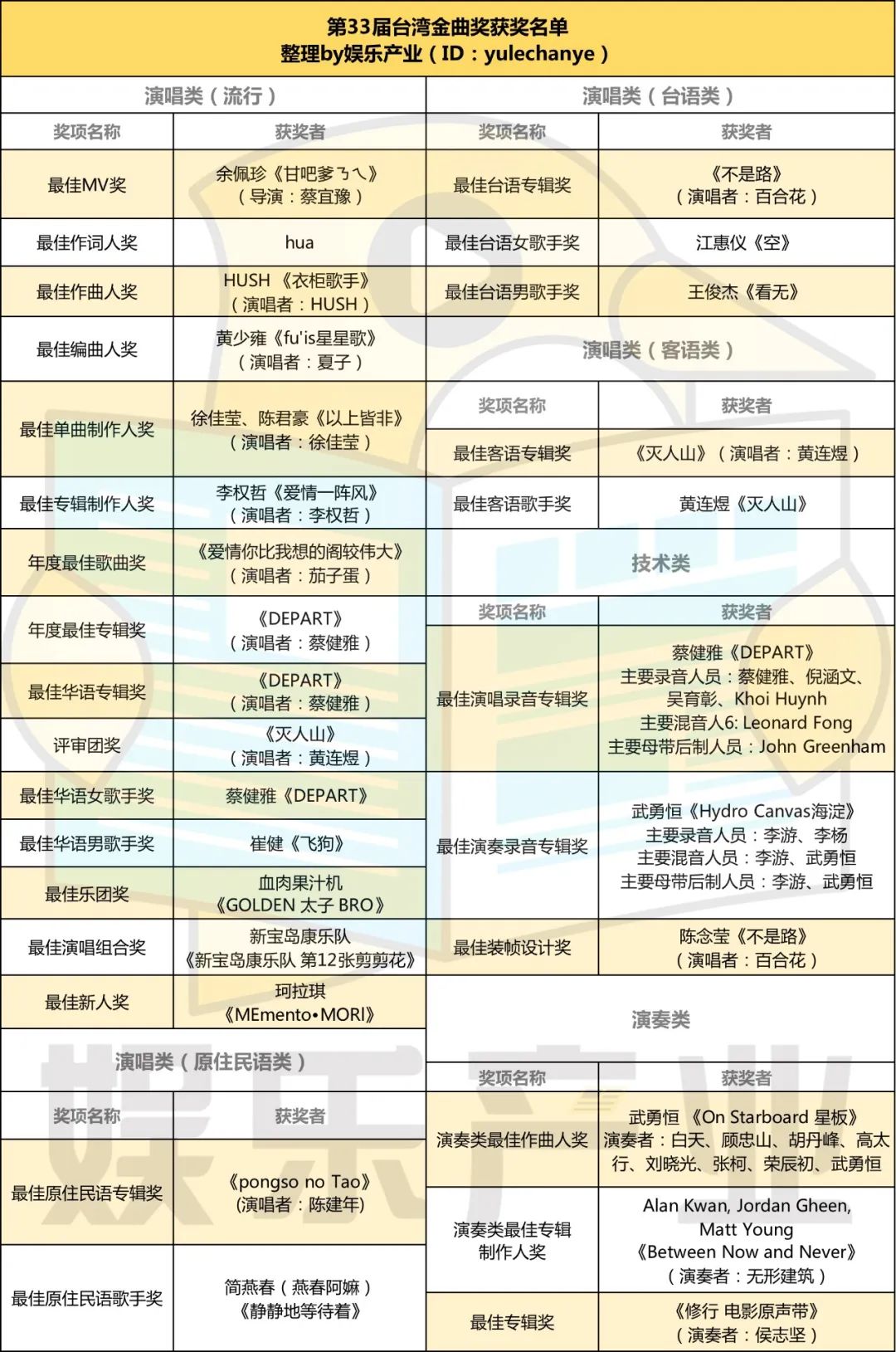 徐佳瑩憑藉《以上皆非》獲得最佳單曲製作人獎項;李權哲以《愛情一陣風》獲得最佳專輯製作人,內地搖滾教父崔健憑藉《飛狗》獲最佳華語男歌手,成為內地首位金曲獎歌王;蔡健雅憑藉《DEPART》囊括了年度專輯、最佳華語專輯、最佳演唱錄音專輯、最佳華語女歌手四項大獎,四封歌后,超過張惠妹成為歌后獎盃最多的歌手,是當日全場最大贏家。