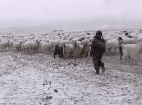 草原上的牧民們把牛羊趕到冬季牧場,準備過冬。