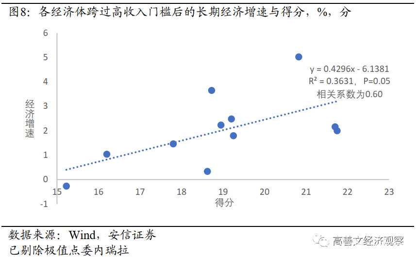 第二,進一步去把樣本彙總在一起形成散點圖來觀察,如圖8所示,橫軸為各國的得分,縱軸為相應的長期經濟增速,其相關係數、擬合優度等統計指標至少是可以接受的,在顯著性水平上也是可以通過檢驗的。所以這些得分在一定程度上能夠對長期經濟增長顯示出預示作用。