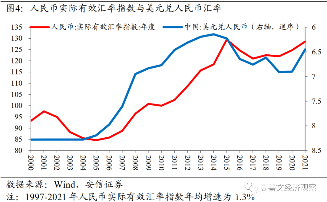 如圖4所示,過去20多年剔除通脹後的人民幣實際有效匯率指數基本上保持年均1.3%以上的增速,這背後反映出了我國國際競爭力和勞動生產率持續上升等諸多因素的影響。