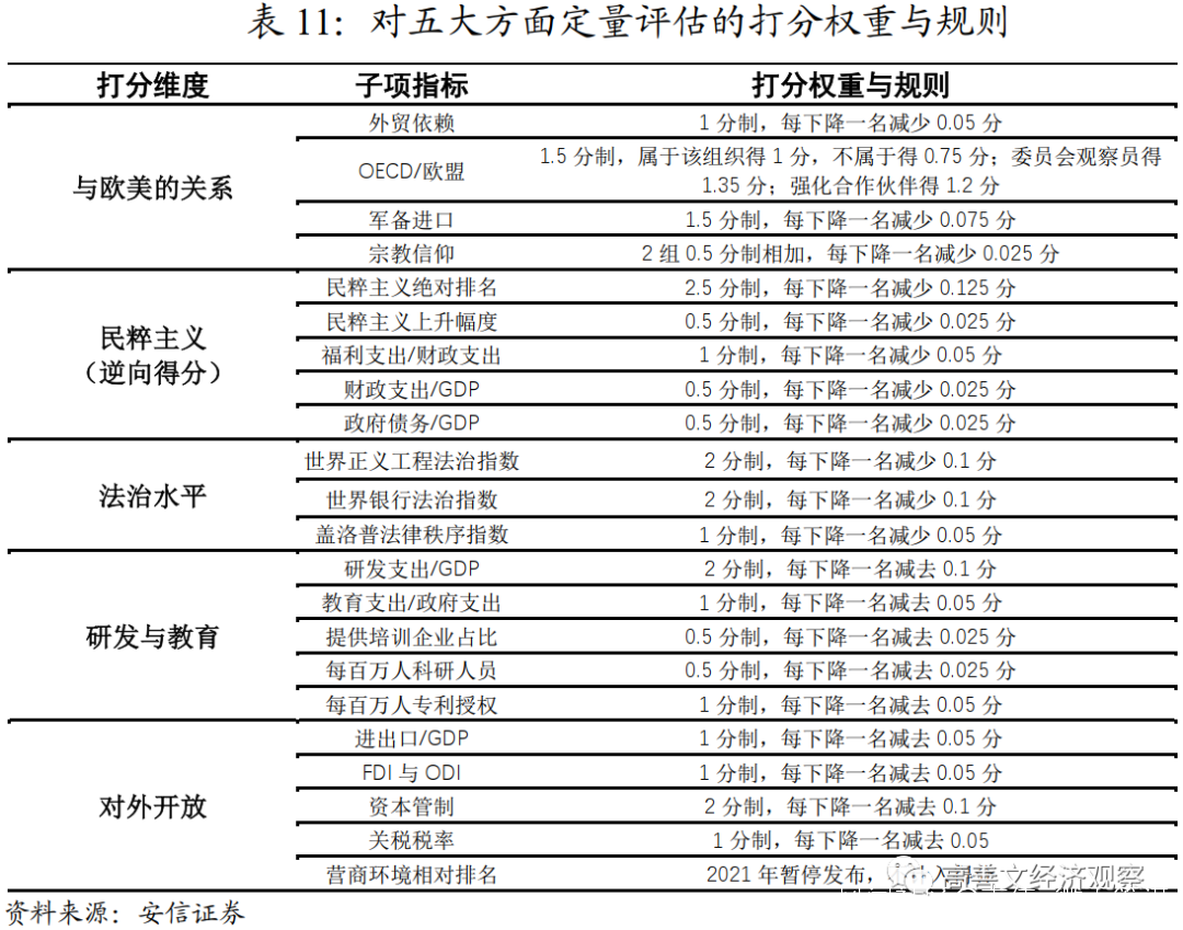 一是以對美國和歐盟的進出口金額佔樣本總進出口金額的比重,來衡量其對歐美的外貿依賴程度,例如荷蘭和德國的這一比重約66%,在原先12個樣本中排在第6-7名之間,故在滿分1分制的條件下給予其0.7分。