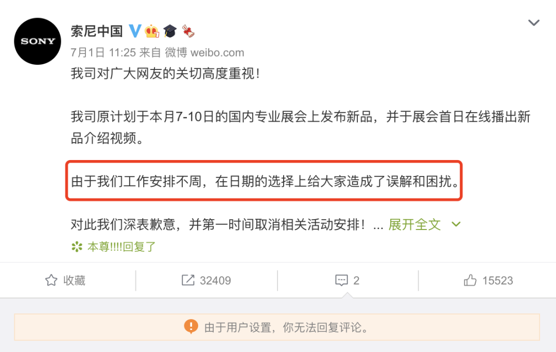 索尼就對此表示“高度重視”,並取消了國內相關活動安排。