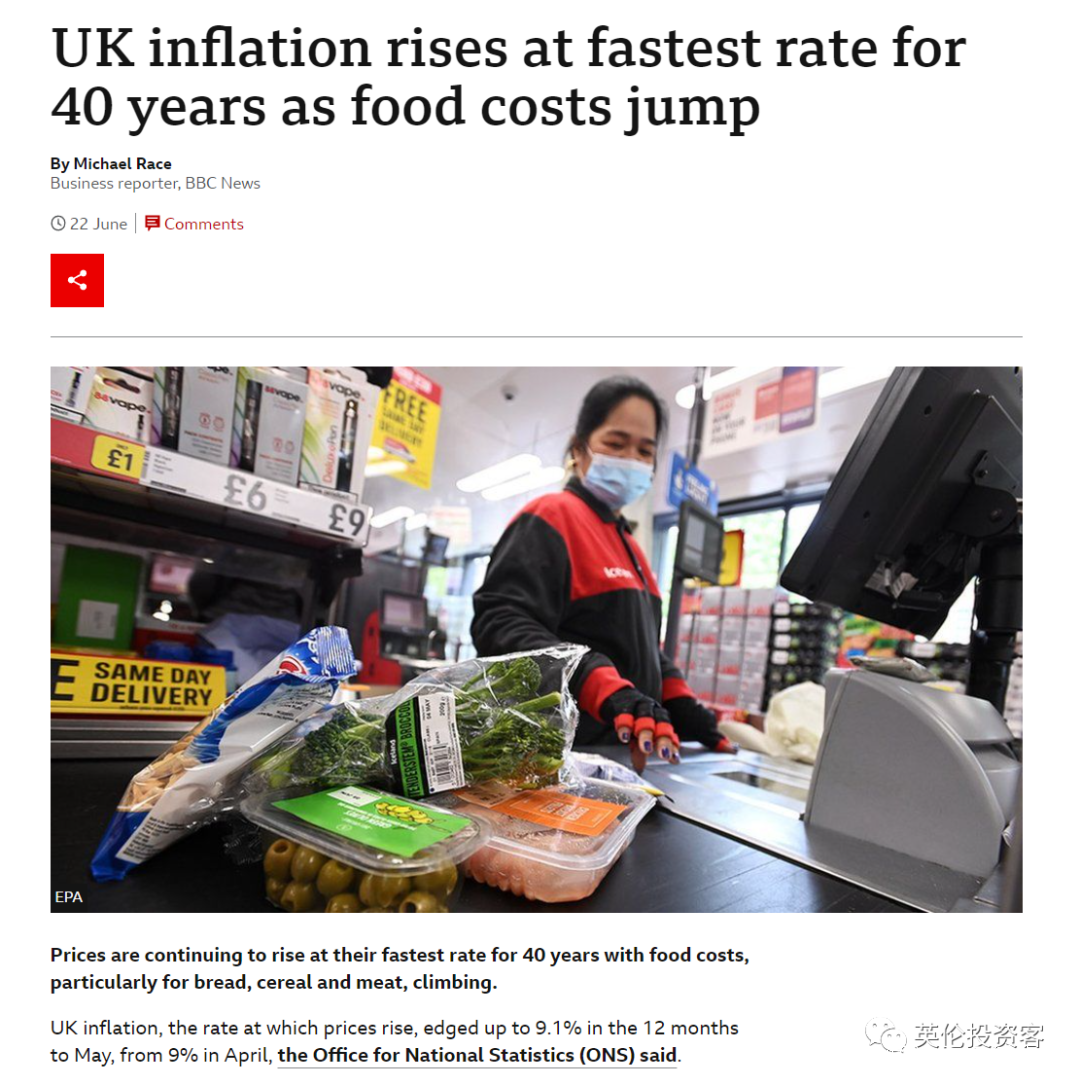 最新的數據顯示:今年6月,英國的通貨膨脹率高達9.1%,為40年新高。