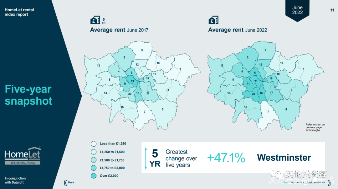 3. 倫敦所有地區中,租金增長最快的是Westminster(西敏),對比2021年6月增長了27.8%,對比五年前同期增長了47.1%。