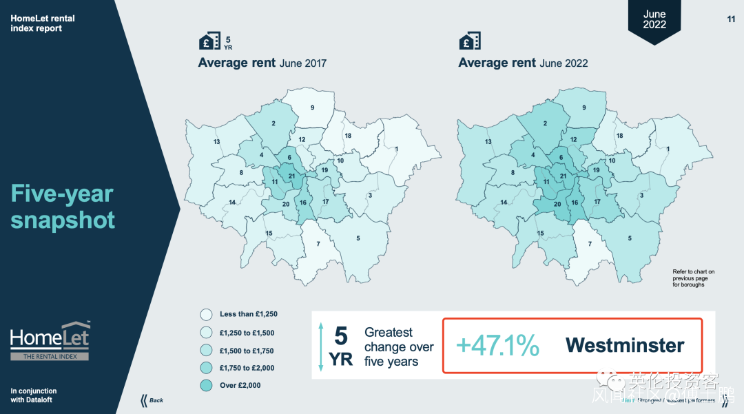 如果和5年前的平均租金相比,如今倫敦威斯敏斯特Westminster的最新租金已經上漲了將近50%,也就是現在一年的租金,放在5年前可以租一年半。