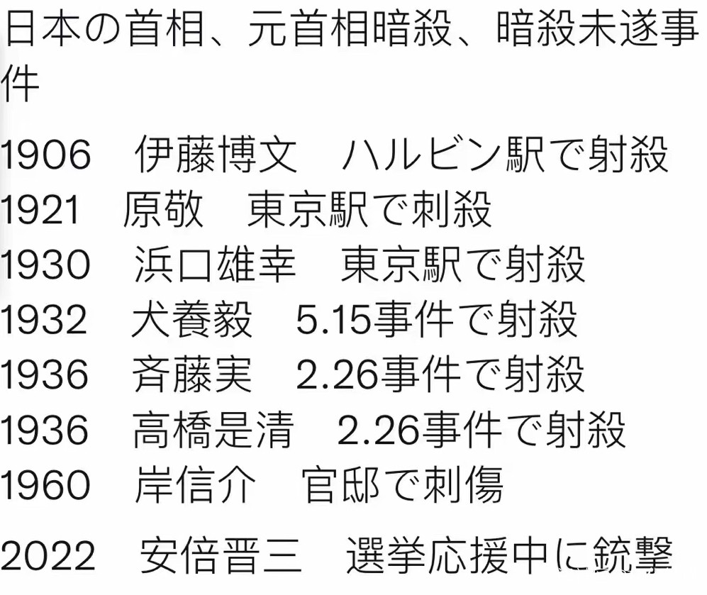 這一意外事件也讓人回想起日本歷史上的政治謀殺現象。在日本歷史上,政壇謀殺行為不僅盛行,而且還往往引起一定的社會支持。本文分析,這種政治 謀殺行為絕非某些狂人的癔病或痴迷,而是有着深刻的歷史社會背景。 早在明治維新時期,對政敵進行肉體消滅,就是當時封建勢力挽救其傳統地位的利劍。 到了大正時代,政治謀殺等恐怖活動日益猖獗, 四大財閥之一的安田善次郎被法西斯狂熱分子刺殺,主張和平外交的“平民首相”原敬在東京火車站被車站職工用匕首刺死,成為日本第一個在任時遇刺身亡的首相。