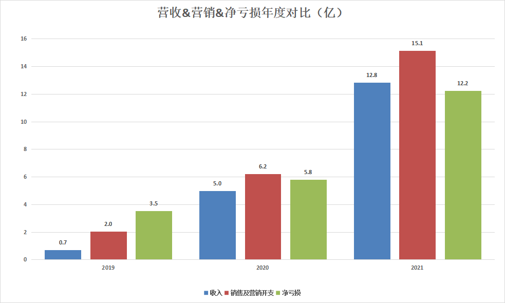 從2019到2021的三年時間,Soul營收分別是0.7億、5.0億、12.8億,增長非常迅速,但相比淨虧損的3.5億、5.8億、13.2億,就是小巫見大巫了。