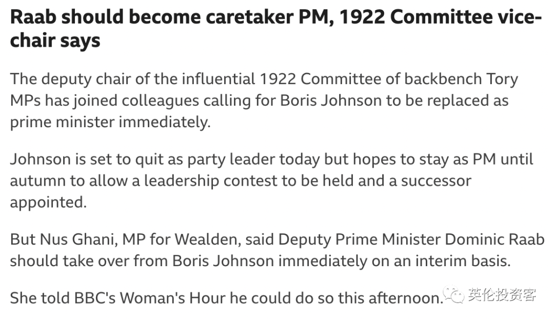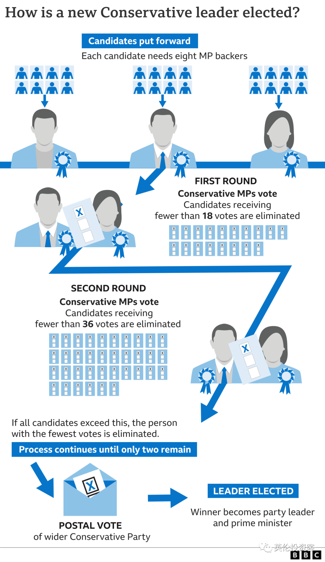 由於保守黨是英國下議院最大黨,鮑里斯下台之後,無論最終誰出任保守黨領袖,都將順應成為英國首相。