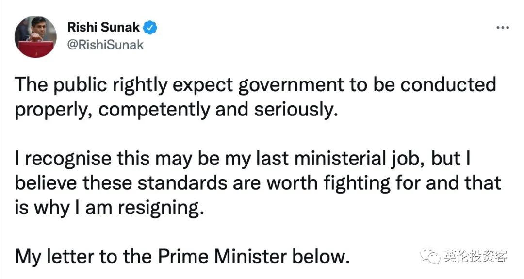 蘇納克在本週二宣佈辭職的推文中表示,這可能是他最後一次擔任英國大臣職務。