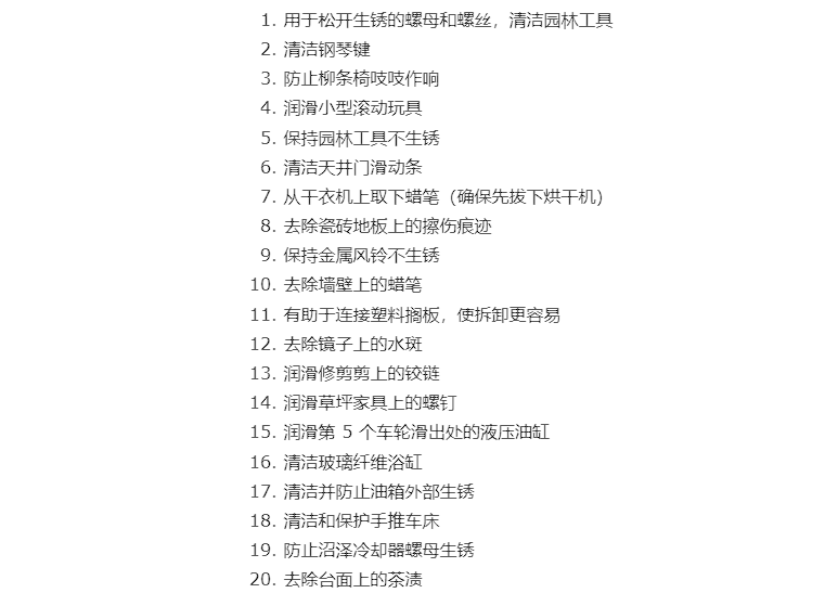 不過 2000 種用途應該是一種誇張的説法,其實裏面好幾種用途嚴格來講都是一樣的,比如給 XX 除鏽、給 XX 潤滑、去除 XX 的污漬等等。