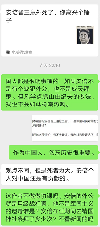 呵,看一看那些為安倍辯護的人真實的嘴臉吧,一邊假惺惺的説死者為大要講人性,一邊去否認我們過去死亡過三千萬中國人民,否認南京大屠殺。