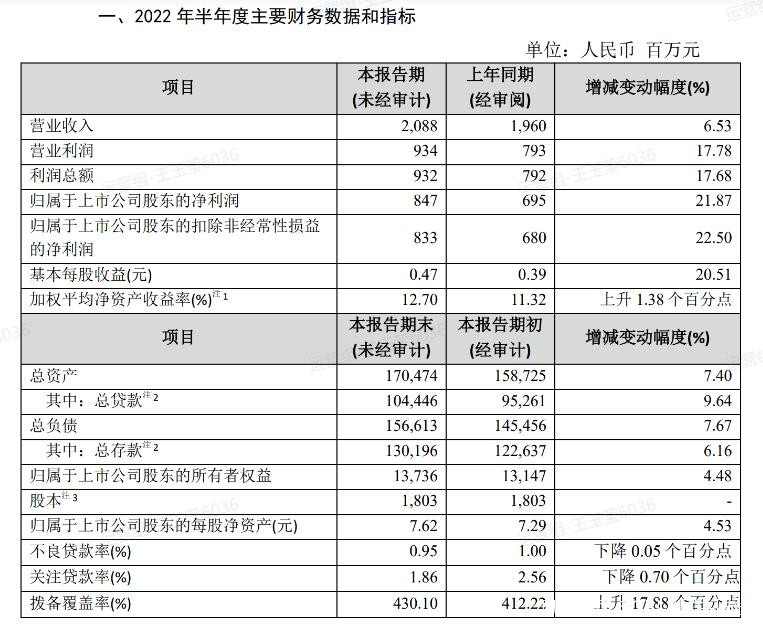 財報顯示,蘇農銀行2022年上半年基本每股收益為0.47元/股,同比增20.51%;加權平均淨資產收益率為12.70%,同比上升1.38個百分點。