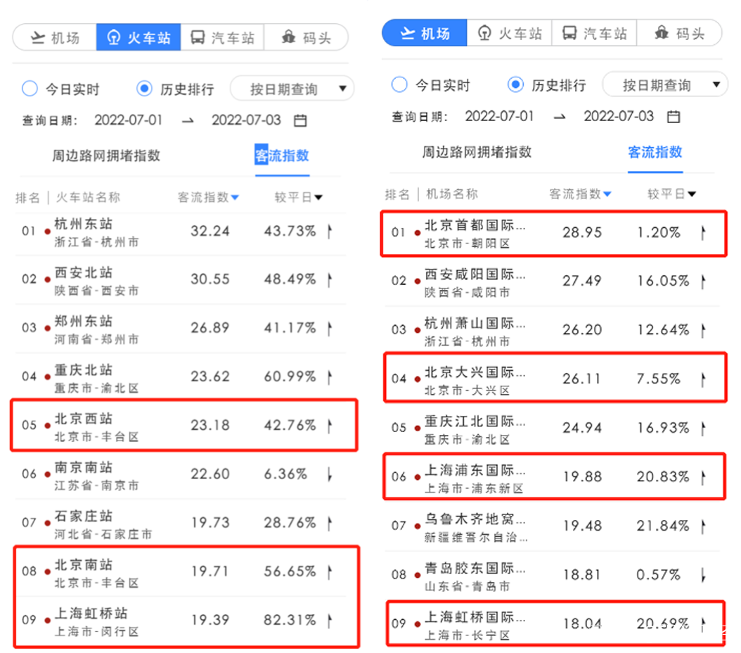 7月首週週五至週日(7月1日-3日),京滬兩地交通樞紐的客流指數上升,其中北京西站、北京南站和上海虹橋站的客流量漲幅較為明顯,躋身全國火車站客流指數Top10;機場方面,京滬兩地的主要機場客流指數均有上漲,北京首都國際機場、北京大興國際機場、上海浦東國際機場、上海虹橋國際機場人流量增加,重現熙熙攘攘。
